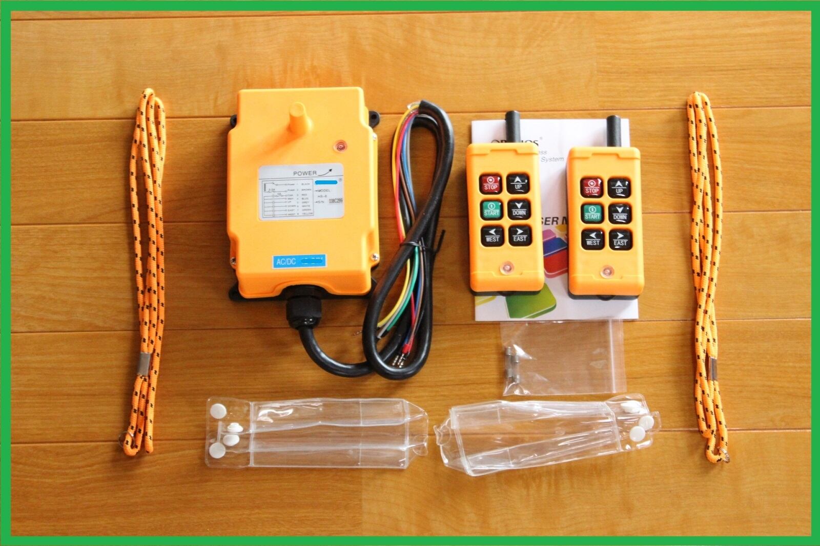 写真に写っている送信機と受信機、送信機カバー、ストラップと説明書のセットになります。電池は郵送の関係で付属しません。市販の単3型か単4型になります。ご自身で用意ください。