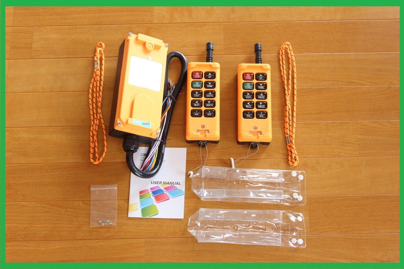 写真に写っている送信機と受信機、送信機カバー、ストラップと説明書のセットになります。電池は郵送の関係で付属しません。市販の単3型か単4型になります。ご自身で用意ください。