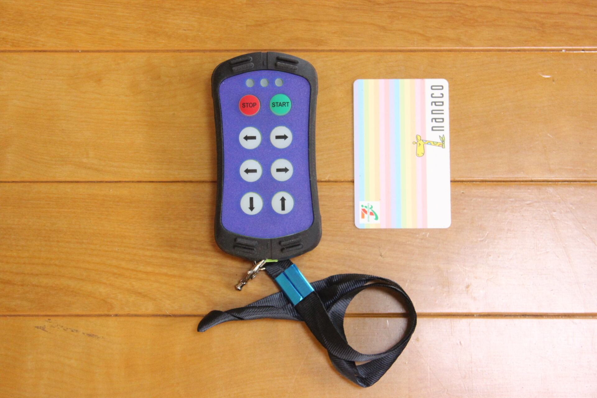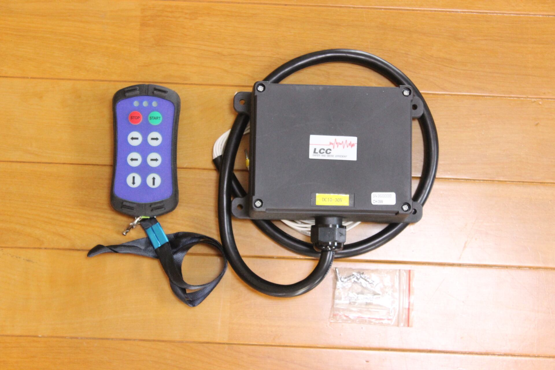 写真に写っている送信機と受信機、送信機カバー、ストラップと説明書のセットになります。電池は郵送の関係で付属しません。市販の単3型か単4型になります。ご自身で用意ください。