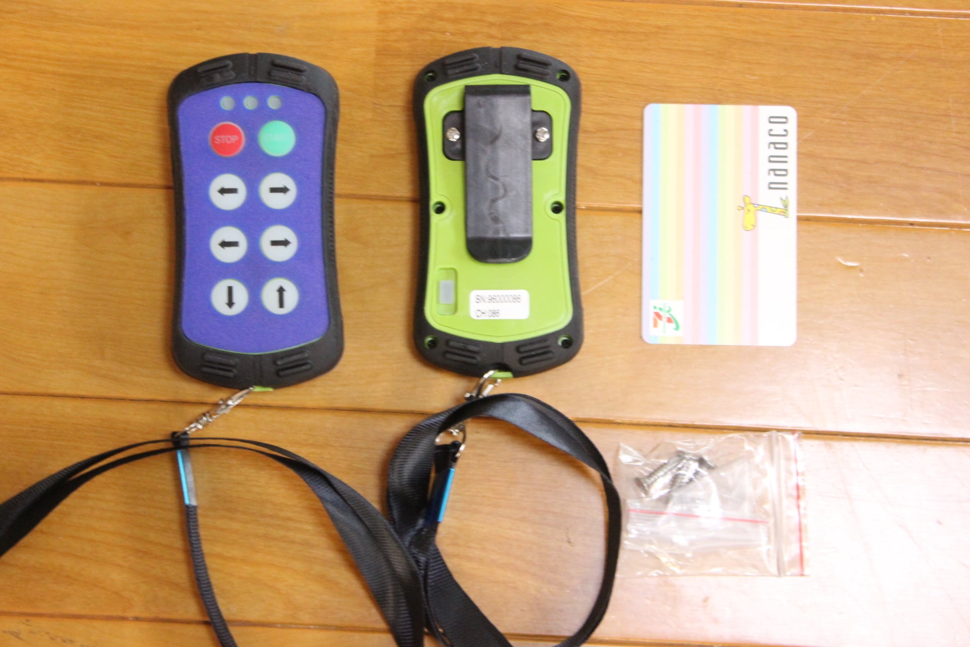 写真に写っている送信機と受信機、送信機カバー、ストラップと説明書のセットになります。電池は郵送の関係で付属しません。市販の単3型か単4型になります。ご自身で用意ください。